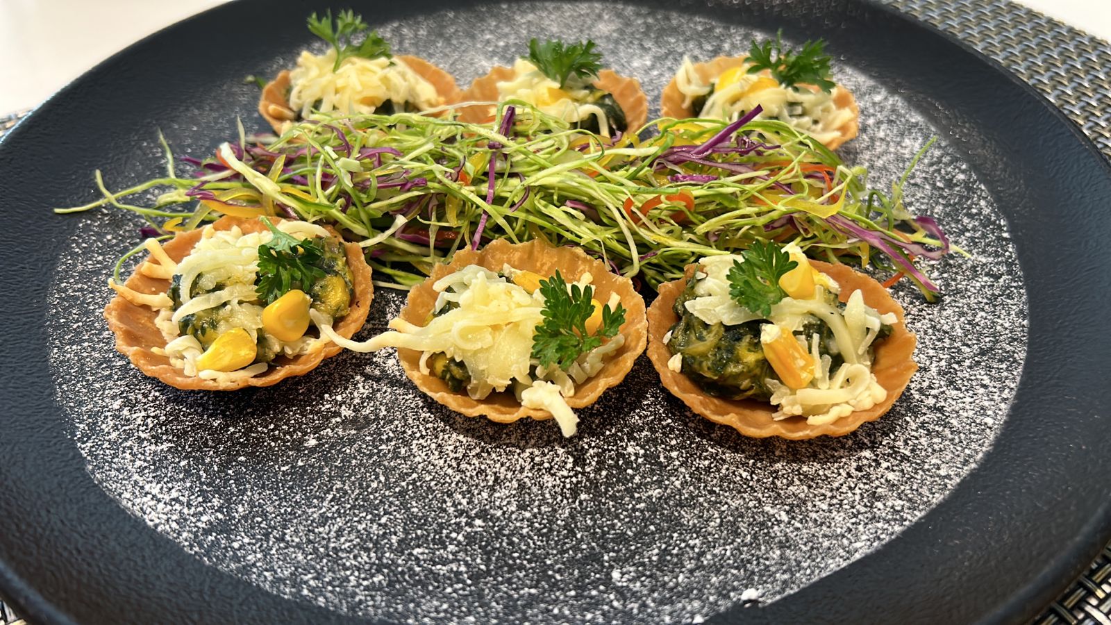 • Take a serving bowl, line it with lollo rosso leaf, put tossed rock corn tempura in the centre, top it with shredded nori sheets and serve.